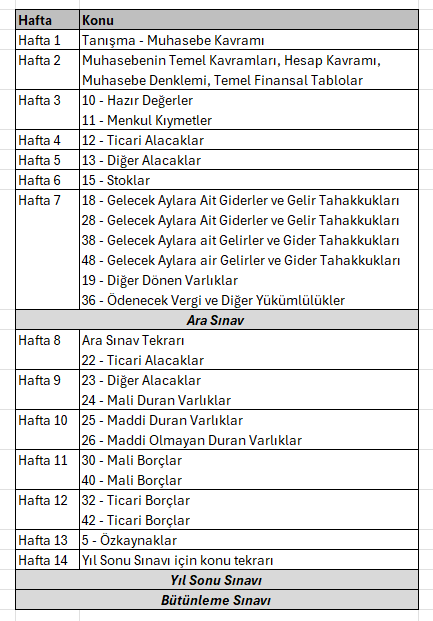 2024-2025 Güz Dönemi Genel Muhasebe dersimiz her Pazartesi günü saat 09.00 – 11.45 saatlari arasında SBMYO 1. Kat Derslik 102 ‘de işlenecektir. Devamsızlık alınacaktır.