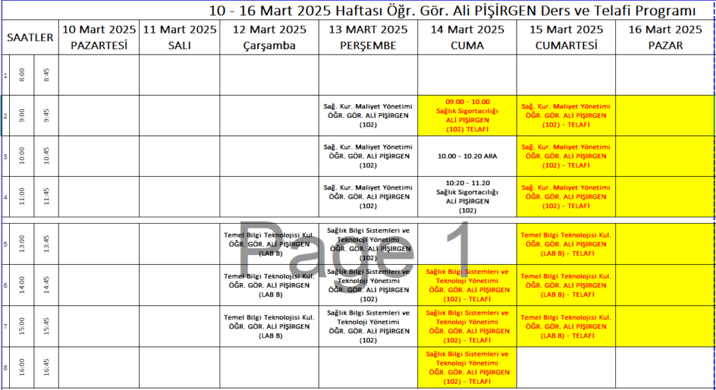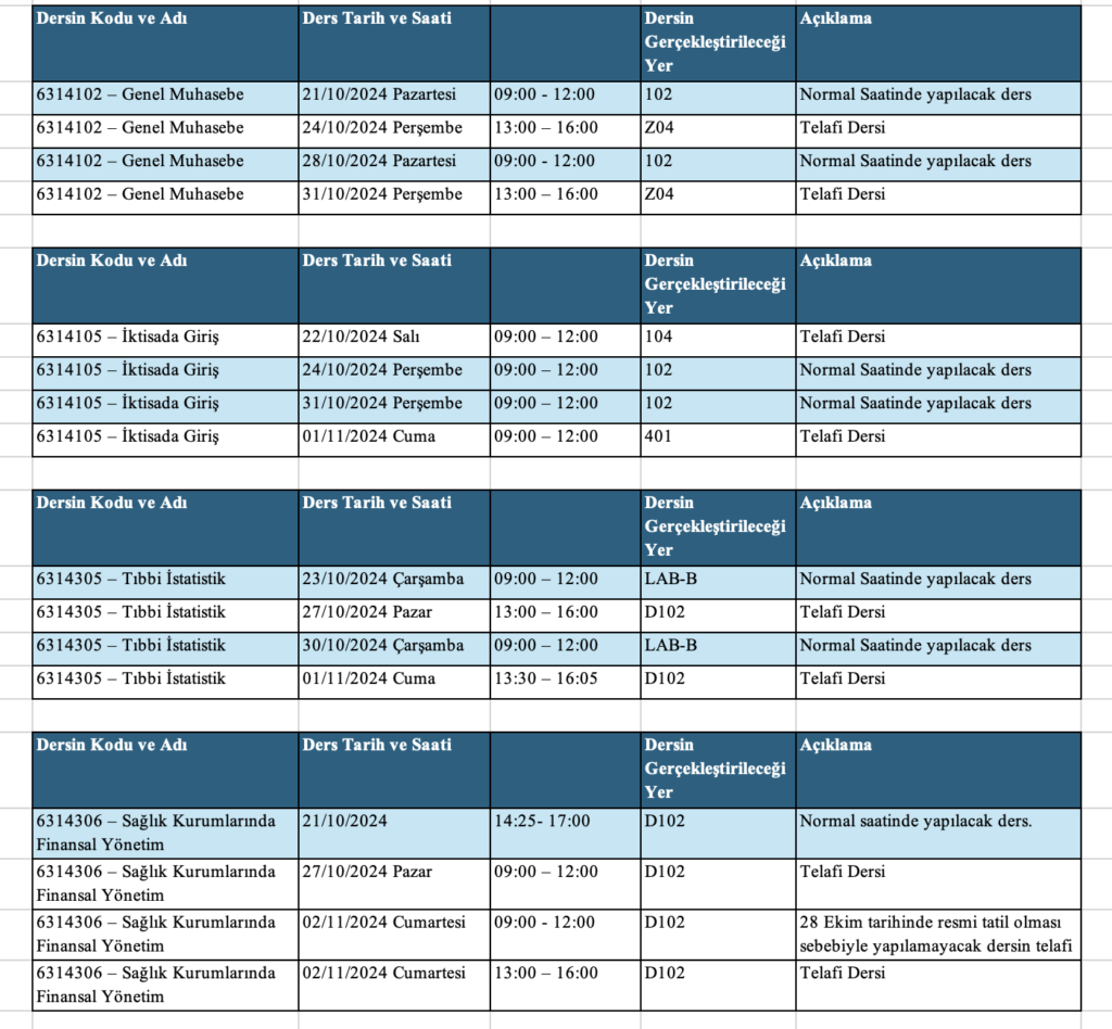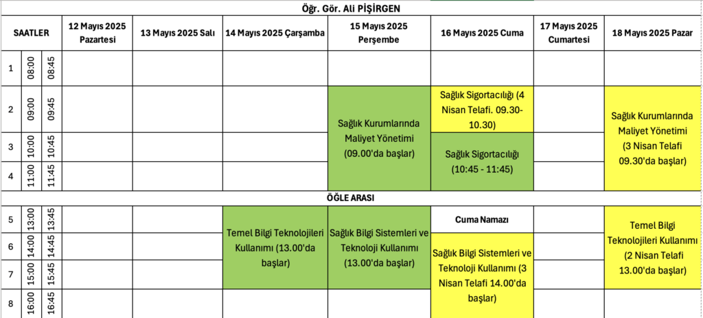 Aşağıdaki linkte Sağlık Kurumları İşletmeciliği ders programını bulabilirsiniz. 22 Eylül’de dersler başlayacaktır. Kendi derslerim için özellikle belirtmek isterim ki devamsızlık takibi yapacağım ve devamsızlıktan kalabilirsiniz. Bu sebeple derse devam önemlidir.